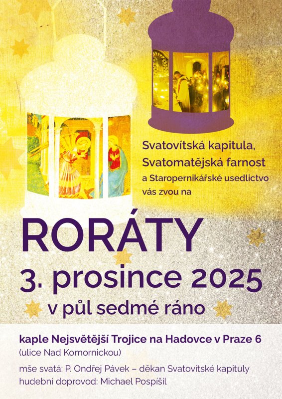 Roráty v kapli Nejsvětější Trojice na Hadovce Ve středu 3.12. od 6:30. Mši svatou slouží P. Ondřej Pávek, děkan Svatovítské kapituly. Hudební doprovod Michael Pospíšil.